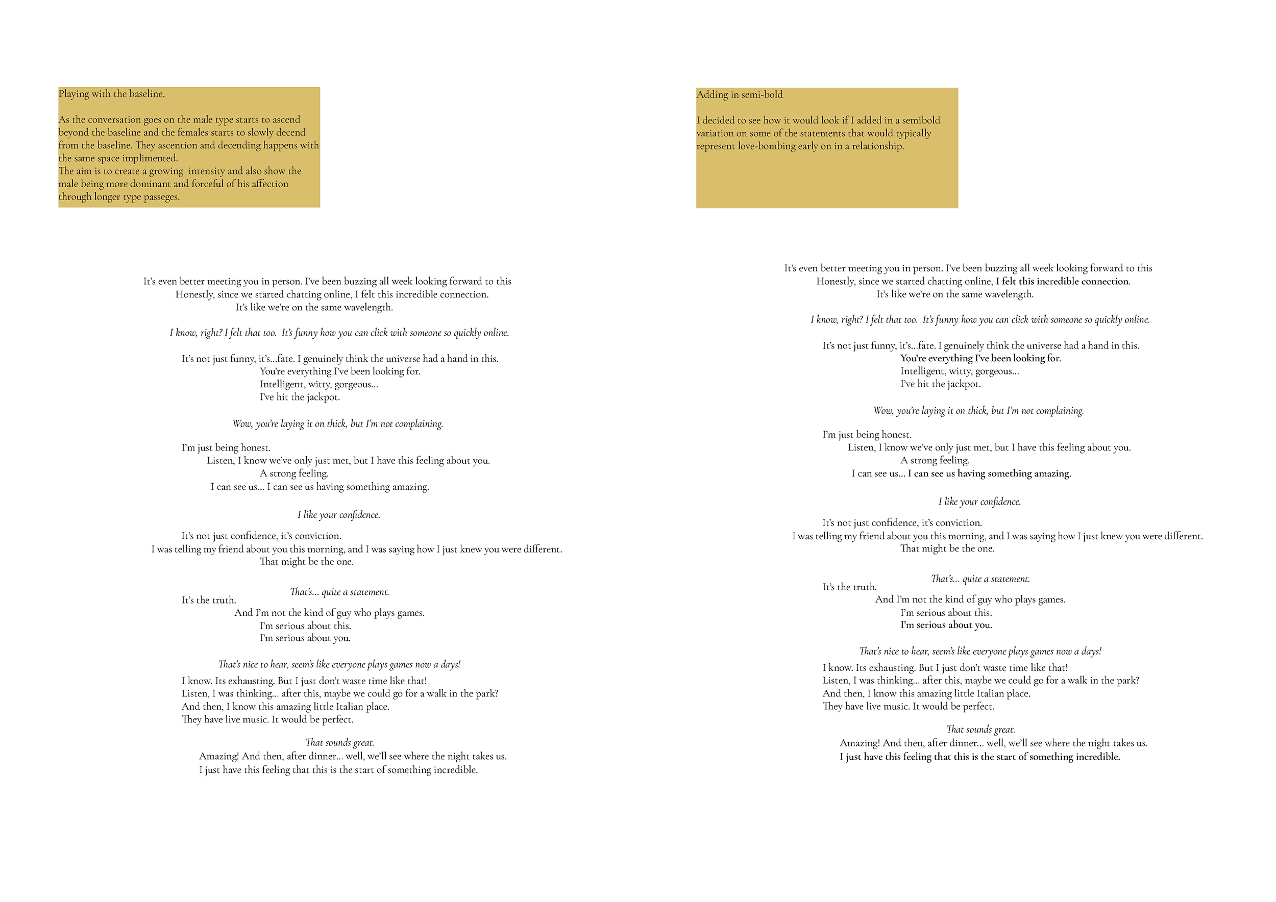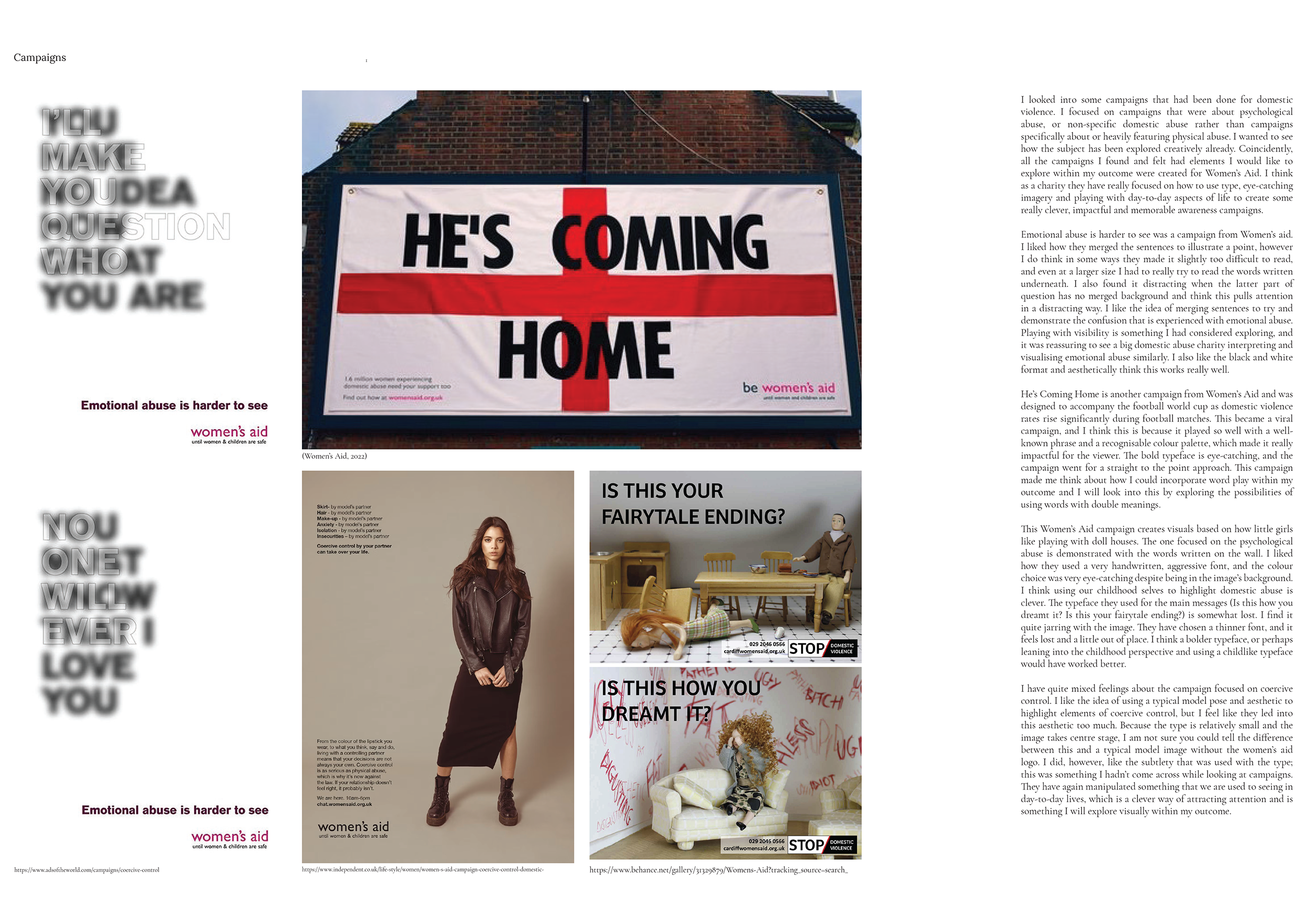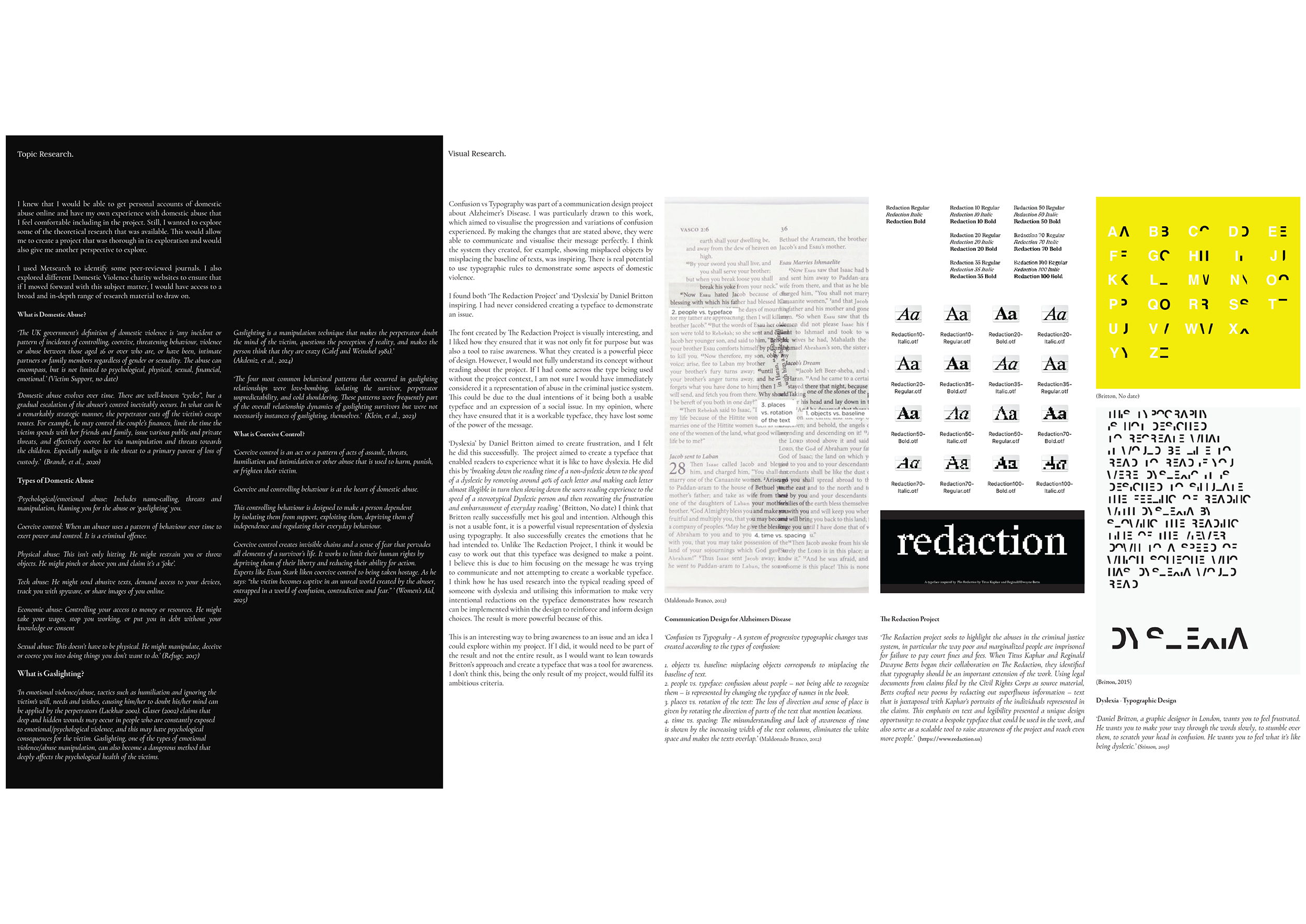 This project was built on extensive research. I explored the complex topic of psychological abuse and its legal history in the UK. I researched previous awareness campaigns and other non-related typography campaigns.