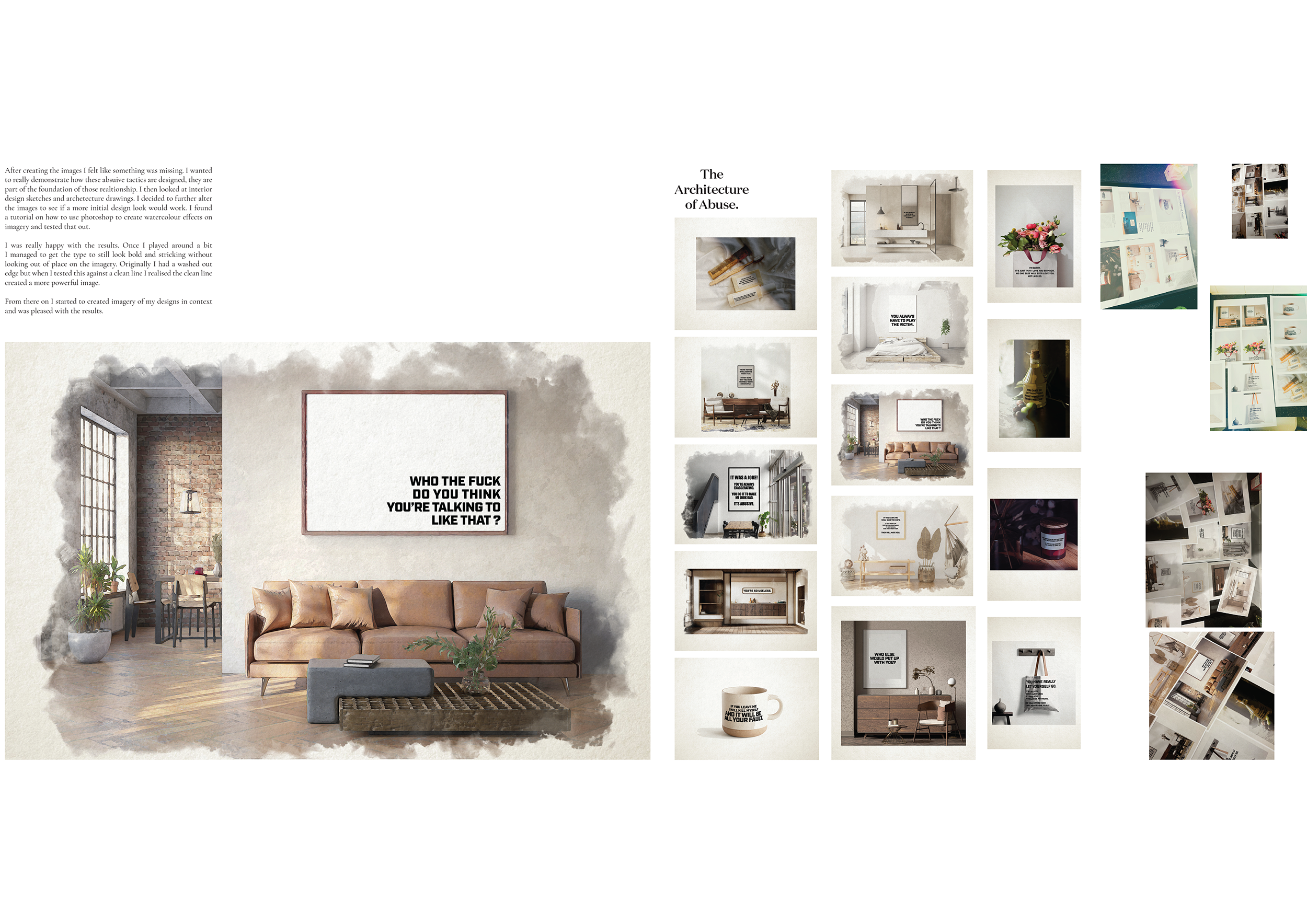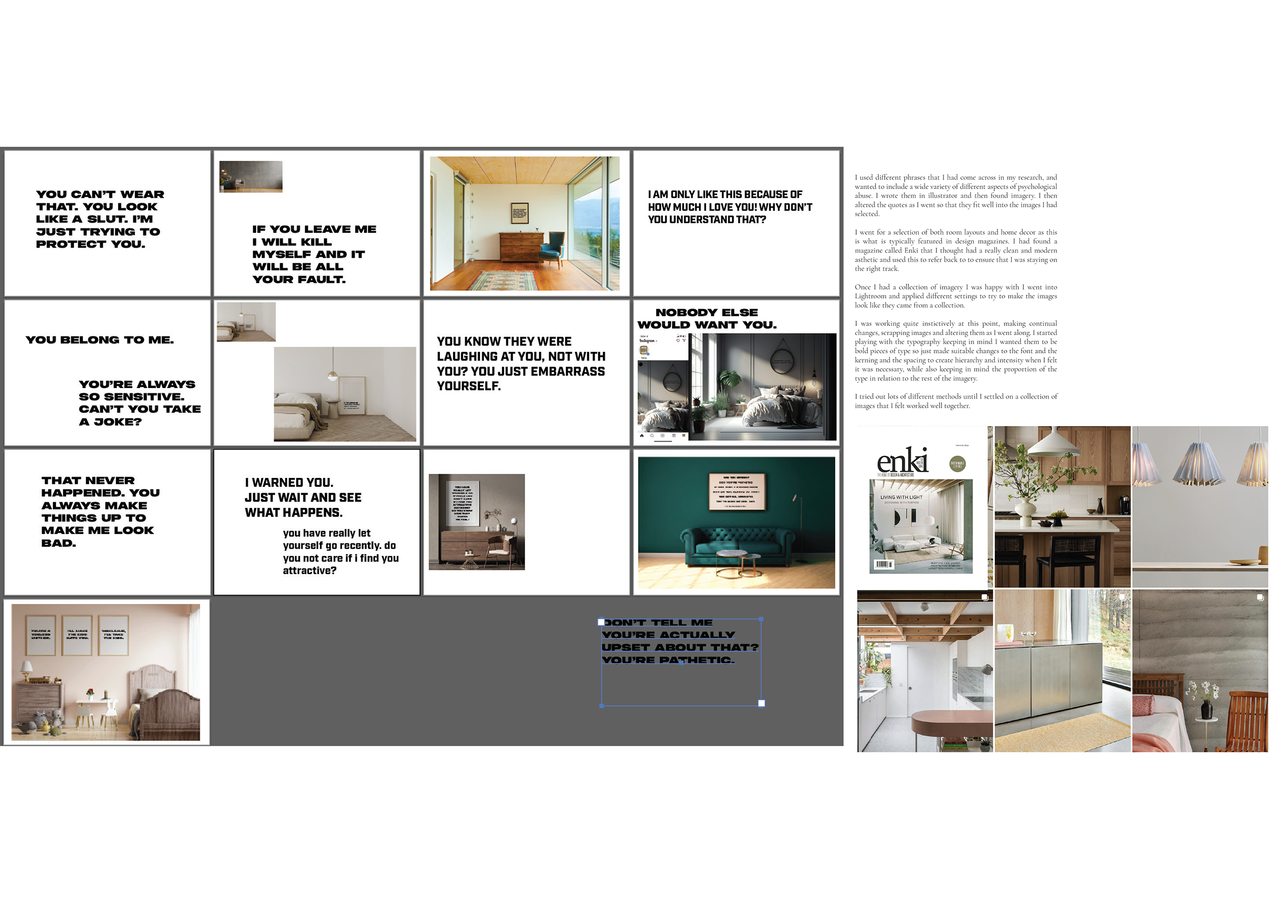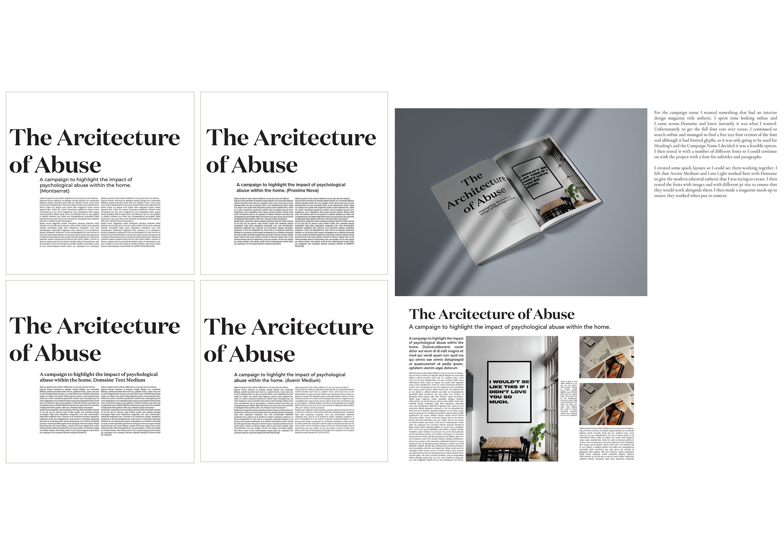 I believe one of the project’s biggest strengths is the concept. The idea of linking psychological abuse [which, by its very nature, is designed] to interior design provided a powerful framework for all the design decisions, from typography to image selection. My love of research allowed me to ensure that I kept the project informed, relevant, and factual.