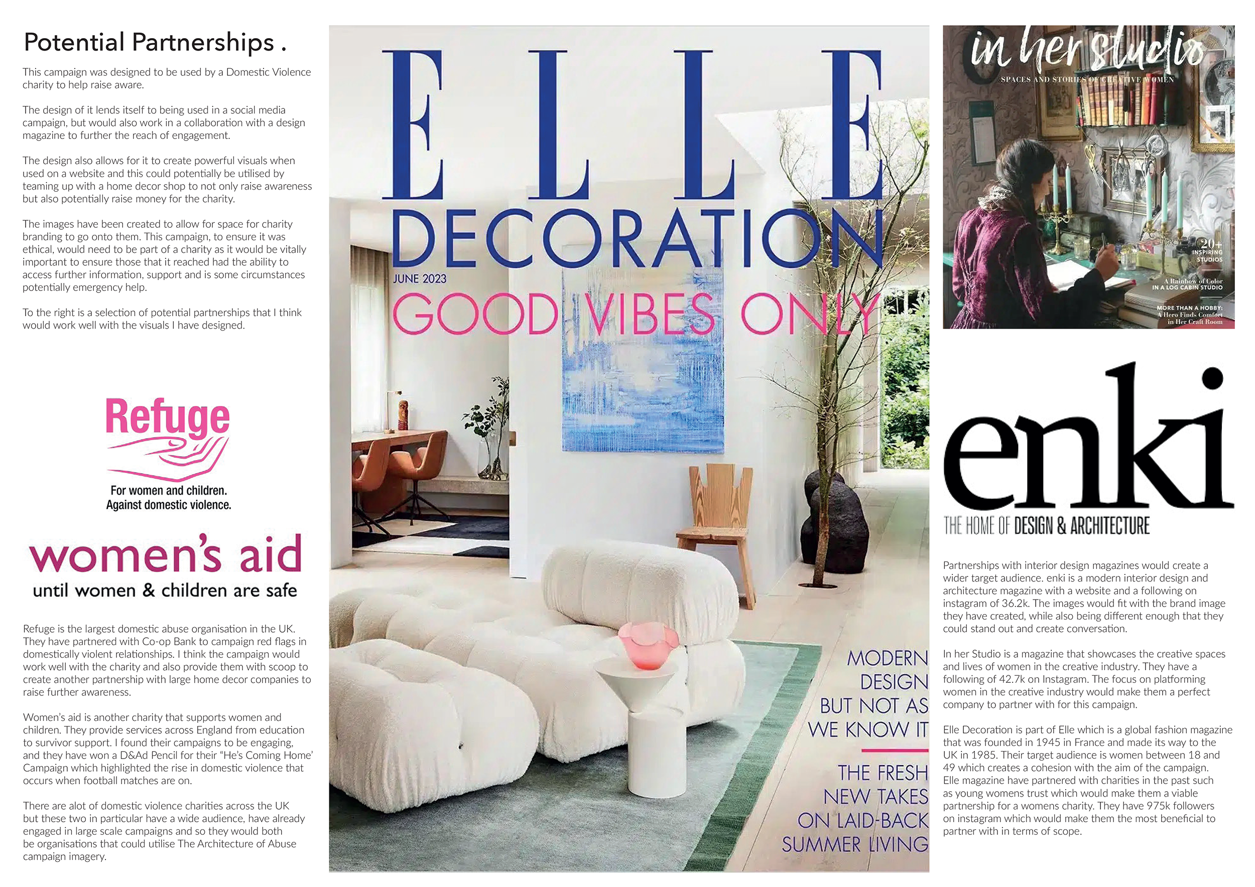 The mockups below demonstrate a visual plan for how 'The Architecture of Abuse' could be featured in leading home and interior design magazines, utilising another form of media to maximise engagement and raise awareness.