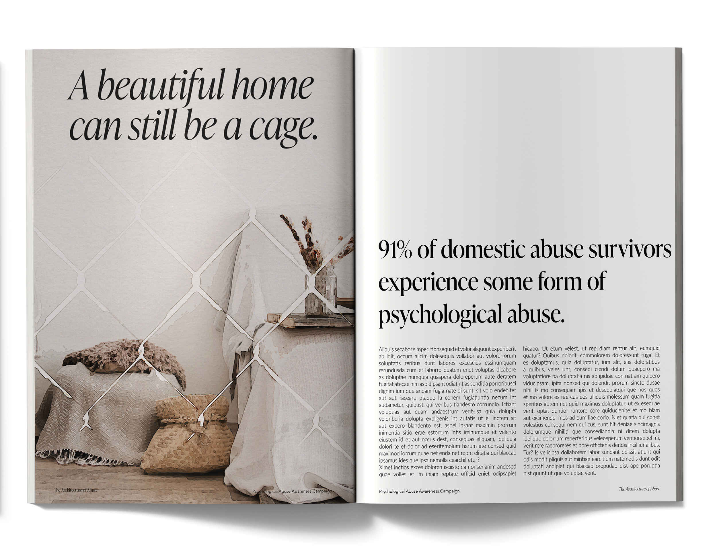 'The Architecture of Abuse' is an innovative awareness campaign created for a UK domestic violence charity. The project visually explores the insidious nature of psychological abuse in a unique way, contrasting the controlling language of abusers with beautiful imagery inspired by interior design aesthetics.