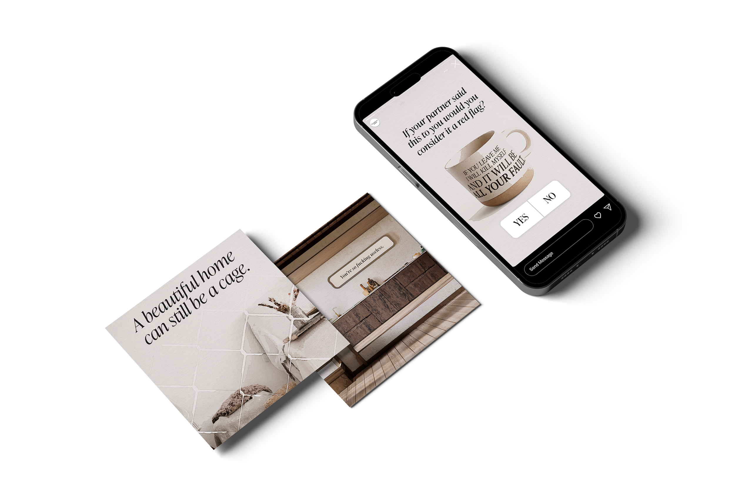 Designed primarily for Instagram's audience of over 2 billion users, the campaign's visuals are crafted for maximum engagement. The use of home decor elements places the campaign directly into feeds focused on interior design, not only reaching an audience, but also allowing it to stand out in a space it is not expected. This approach transforms the issue of psychological abuse into a visually compelling and shareable message.