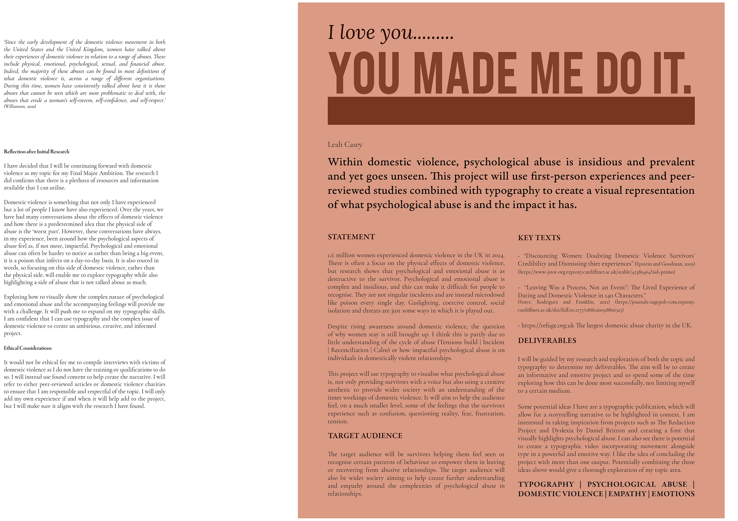 This project was built on extensive research. I explored the complex topic of psychological abuse and its legal history in the UK. I researched previous awareness campaigns and other typography campaigns.