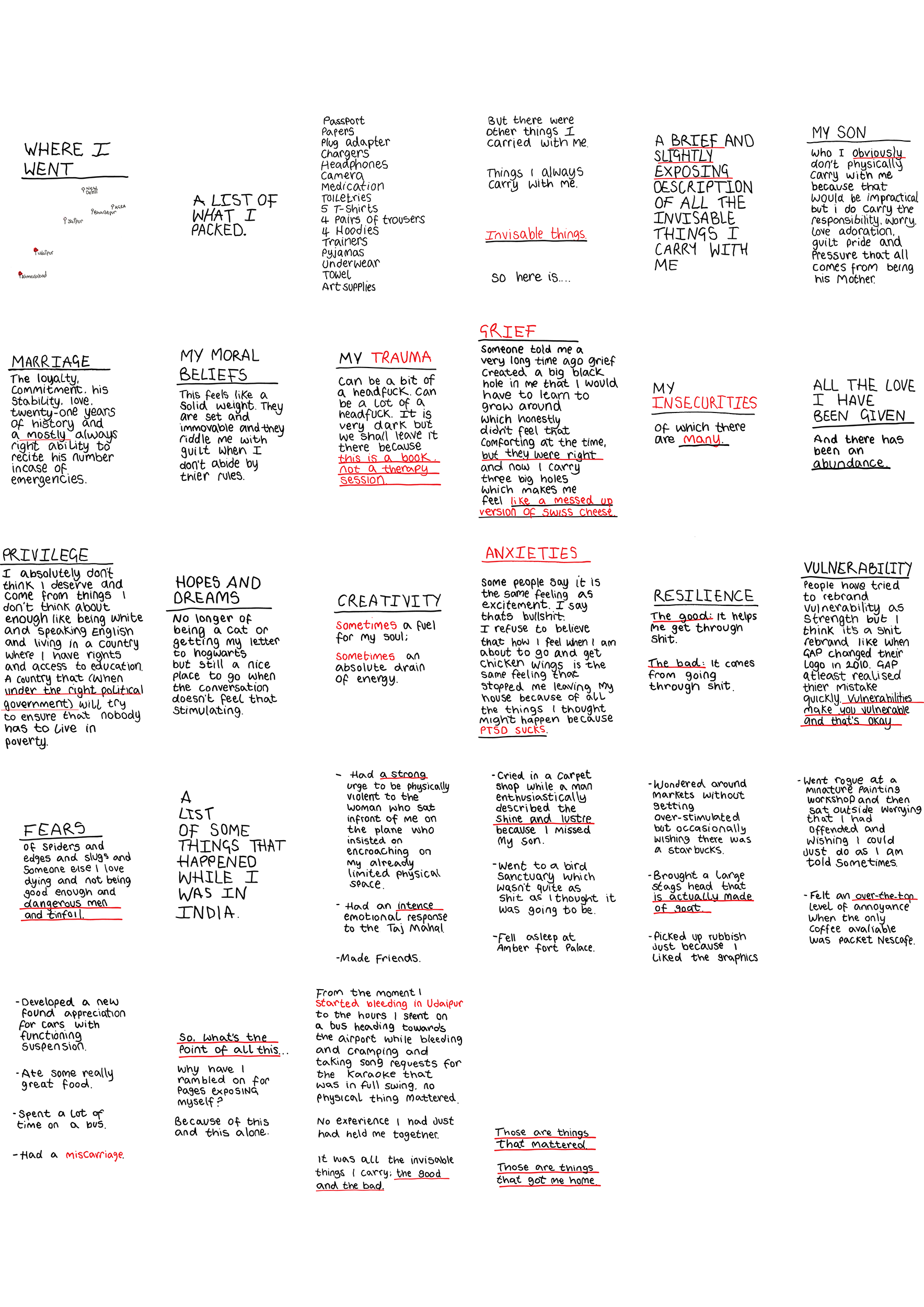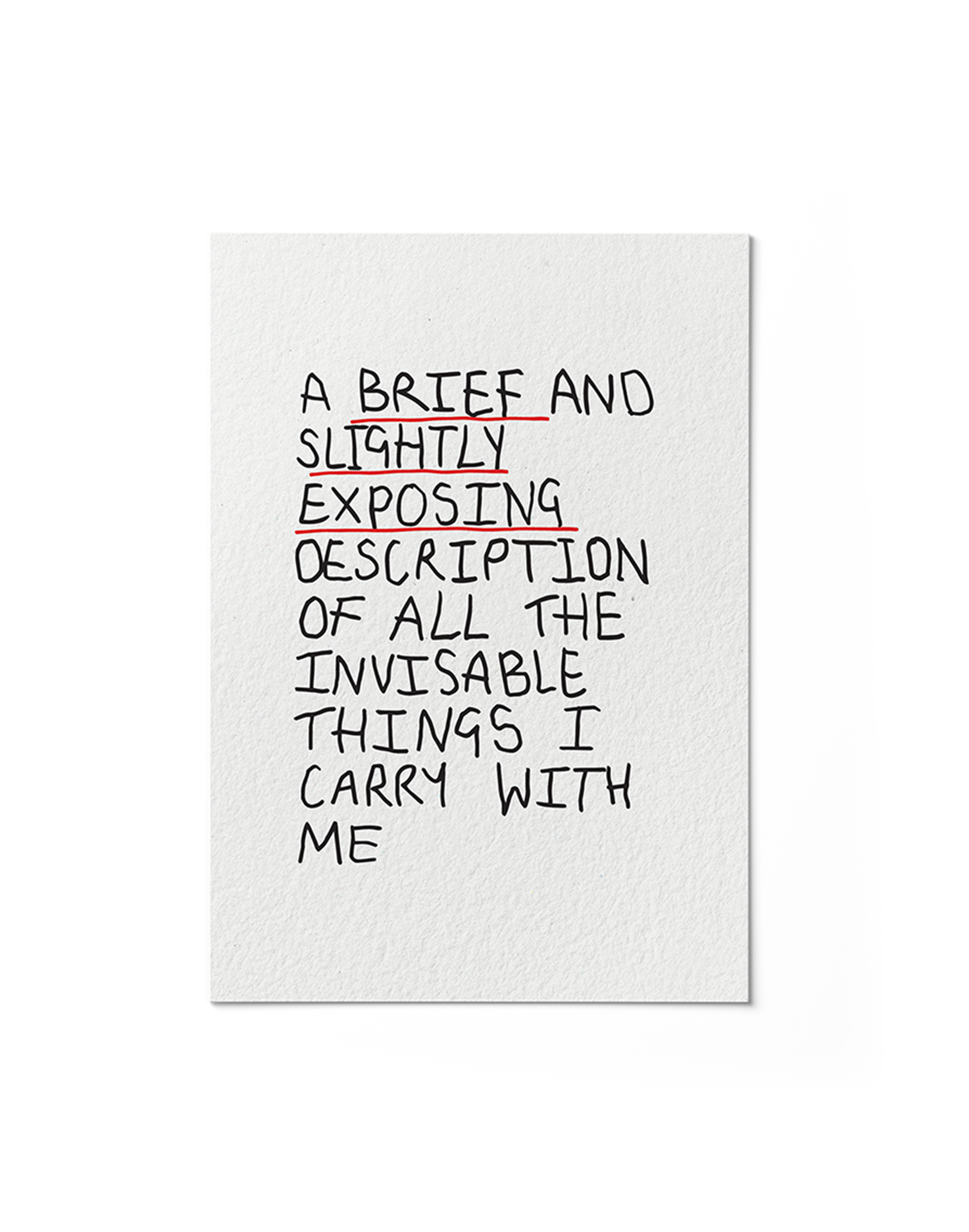 The central concept of ‘This is a Heavy Book’ is to reveal the hidden weight of our personal experiences and communicate how we are a sum of all of them. Each can serve as a tool we can utilise when dealing with difficult and challenging situations. It aims to foster human connection by being transparent about the myriad of things I carry with me in the hopes that it helps people see that they are not alone with their baggage, and that actually, we all have stuff we carry, even if we are not open about it.