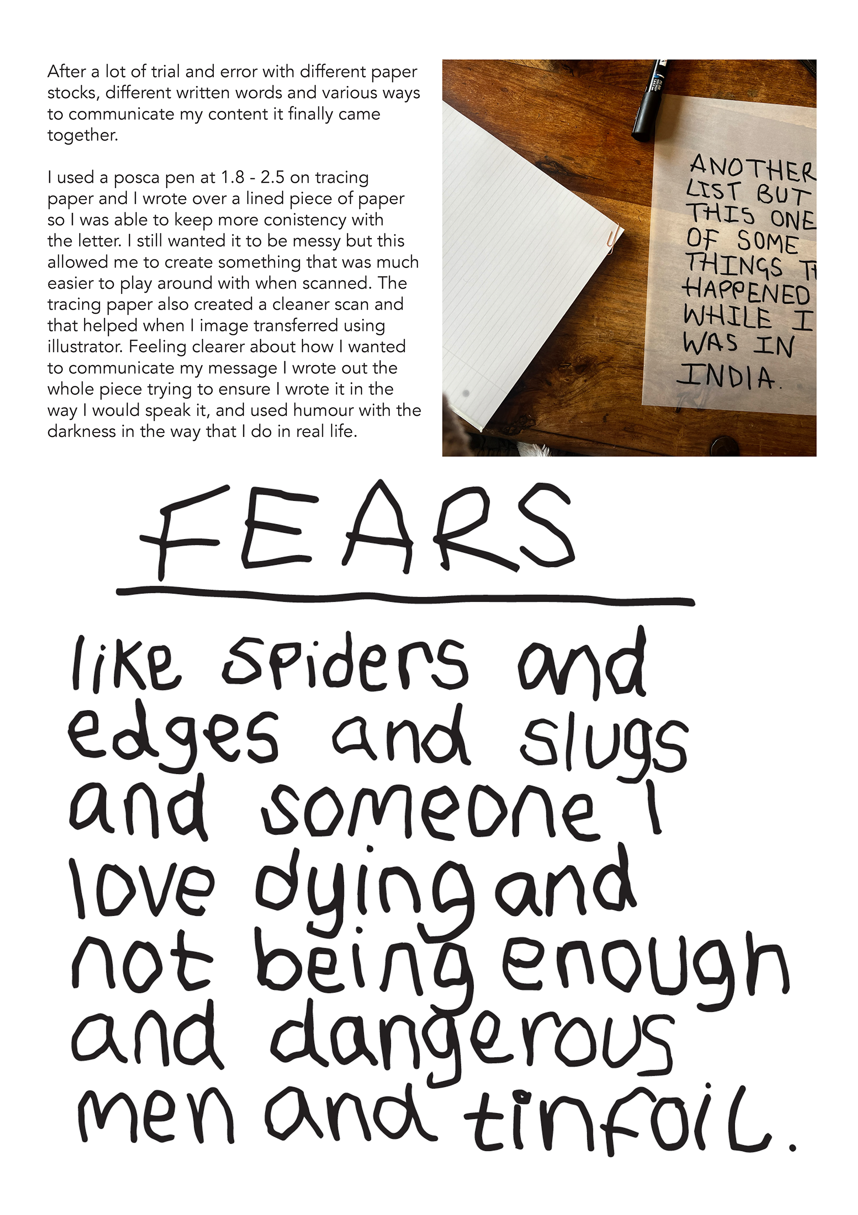 Working on ‘This is a Heavy Book’ was a chance to use graphic design as a tool for personal expression and introspection with an audience in mind. I took a hard and testing personal experience and turned it into something that I hope could help the someone feel seen and understood. I also wanted to open about my experience of a miscarriage. I have had more that one and know that it can leave you feeling isolated as it is not a topic often openly discussed. I hope that being transparent about my own experiences would help someone feel less alone. The design choices were based around creating something that I not only felt like reflected me and my voice but also felt approachable and offered some relief from the more difficult aspects of the book. This project is a demonstration of my belief and passion in the power of design to convey and reflect on the human experience and how this can help foster human connection and understanding.