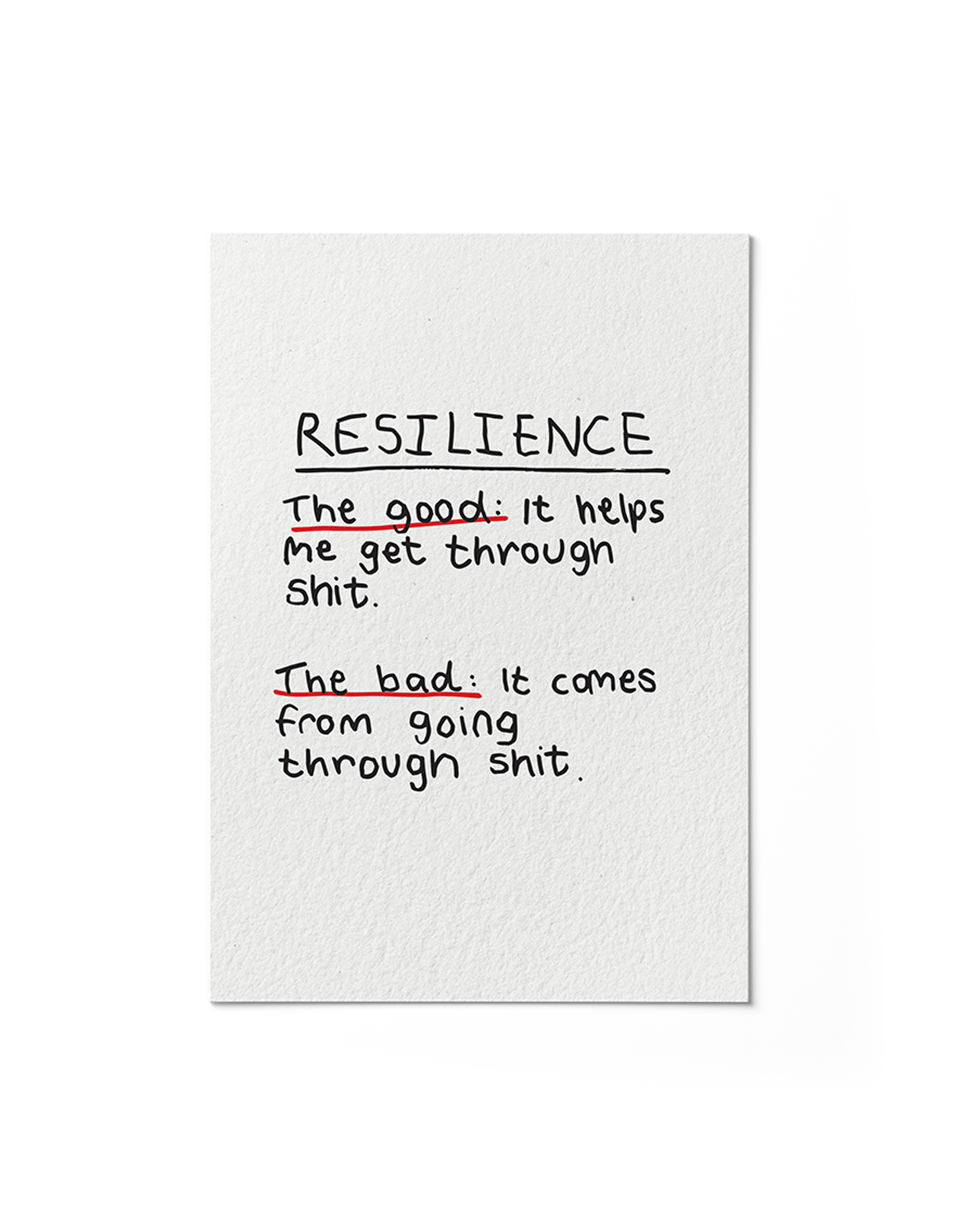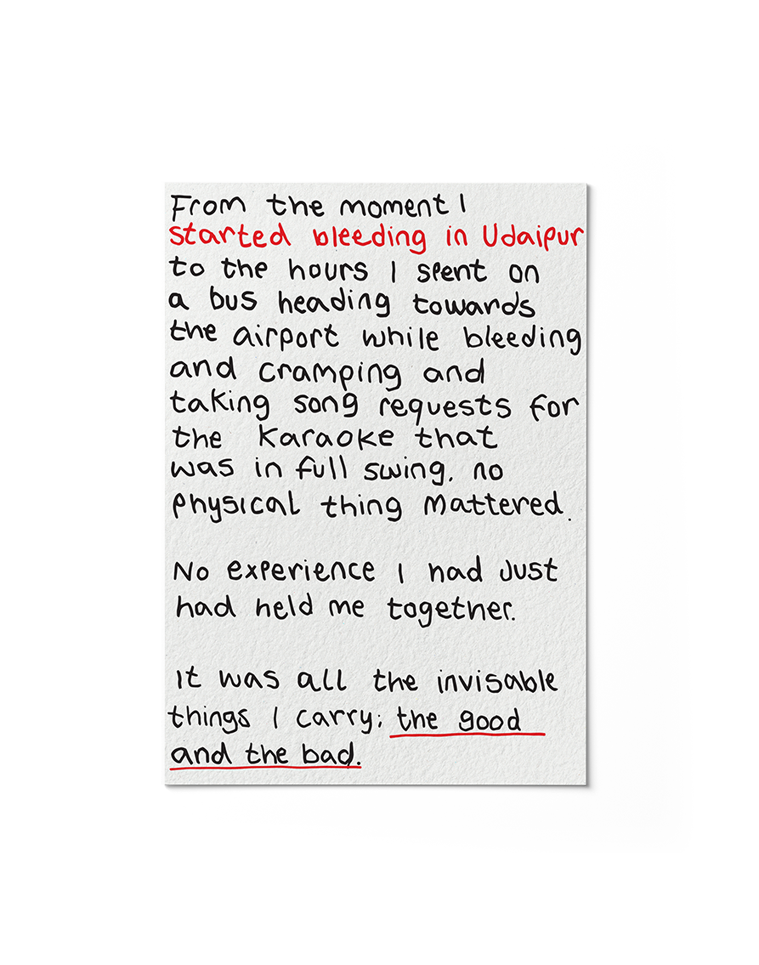 A simple and cohesive colour palette was maintained throughout the publication, ensuring the words remained the central focus. This choice avoided any visual hierarchy, treating each experience equally to ensure that the overall message [that both good and bad experiences can ultimately serve us] was not lost throughout. The tone is intentionally casual and direct, using humour and matter-of-fact language to build a personal connection with the reader. I wanted them to feel like I was talking directly to them. This combination of a vulnerable visual style and a relatable voice helps the personal and sometimes painful topics become a shared human experience. The goal was for the reader to see themselves reflected in the book in the hope that it would leave them feeling less alone with their own baggage.